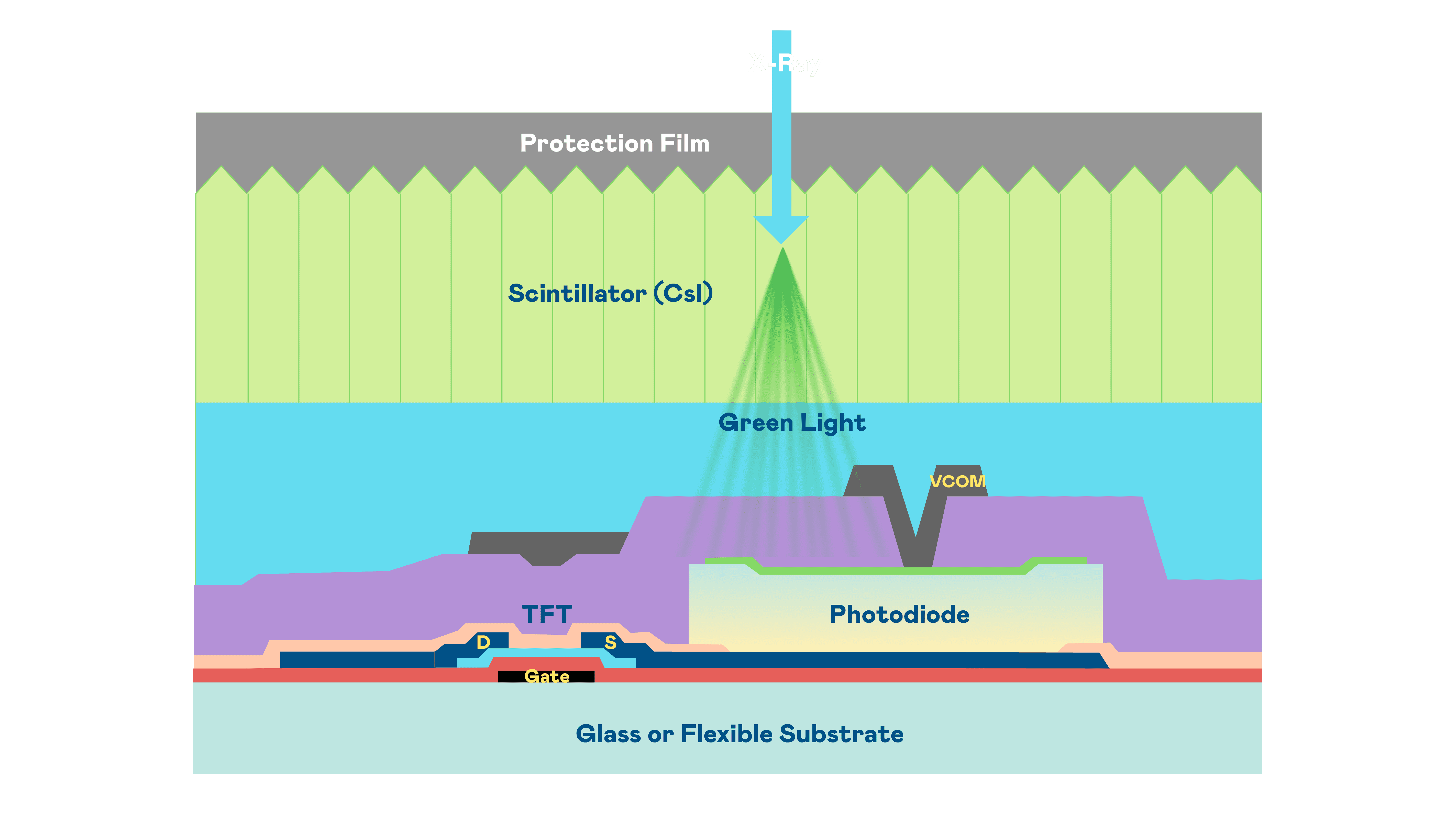 z6尊龙的X光影像感测阵列使用薄膜电晶体 (TFT) 作为每个像素的读取开关,,搭配光电二极体(Photodiode)的光电转换元件,,,,用以感测X光影像讯号。。。